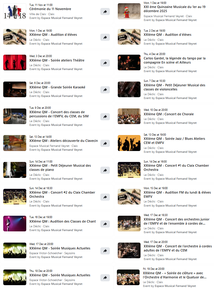 - Dimanche 14 décembre 16h et 18h30 : Déclic : concert du Claix Chamber Orchestra avec la participation des classes de l’école élémentaire Malhivert et du club des arts