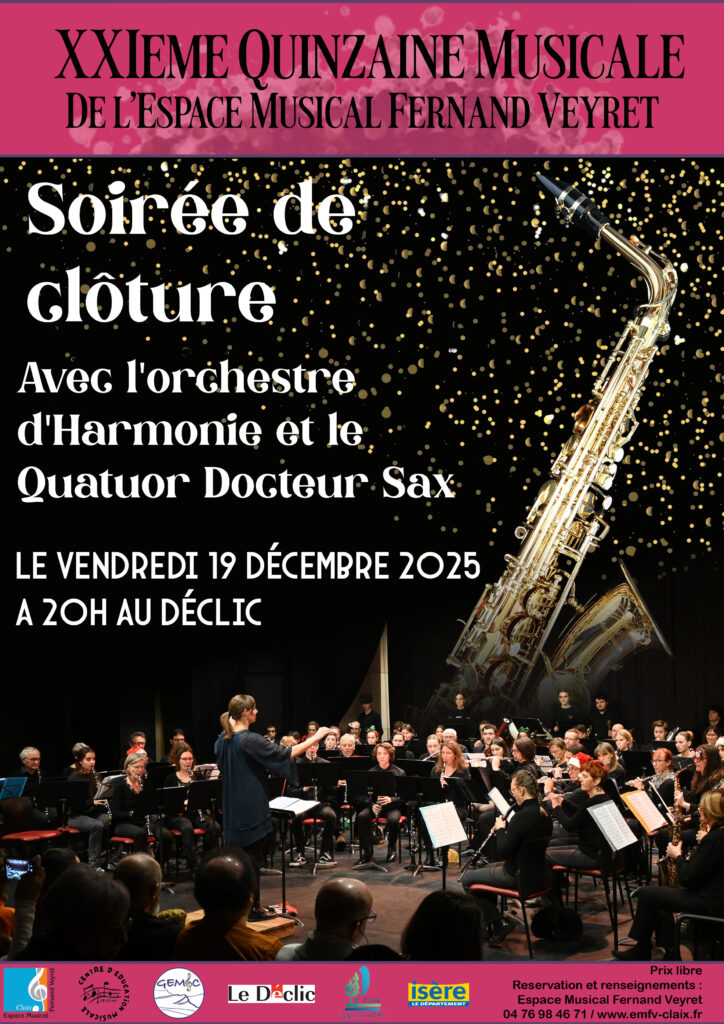 Enfin, vendredi 19 décembre à 20h au Déclic, l’orchestre d’Harmonie invite le Quatuor de Saxophone Docteur Sax. (Réservations à partir du 9 décembre). De quoi clore cette 21ème Quinzaine Musicale et l’année en beauté !