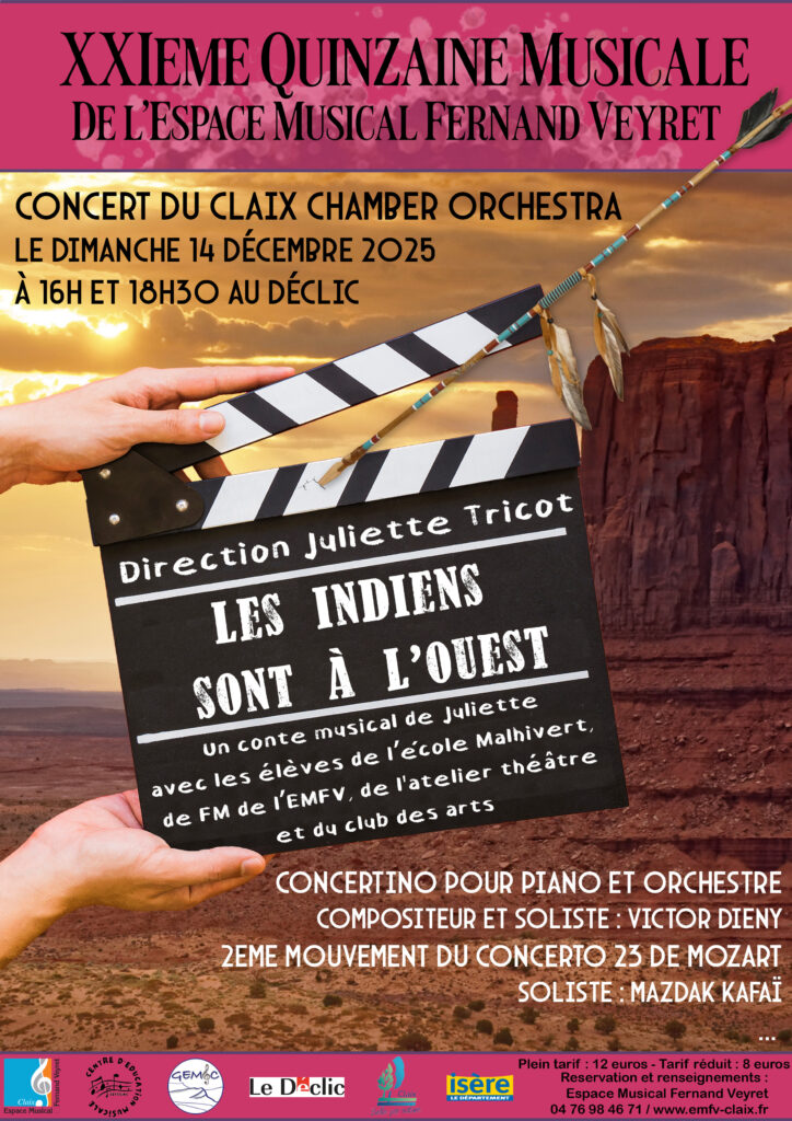 Le Claix Chamber Orchestra (CCO) sera comme d’habitude au rendez-vous, pour un programme de musique classique. Vous aurez également la chance d’assister à la création mondiale d’une très belle œuvre pour piano et orchestre composée par un de nos anciens élèves et ancien enseignant, Victor Dieny, aujourd’hui étudiant au Conservatoire Supérieur de Musique et de Danse de Paris. Enfin, le CCO accompagnera les élèves des classes de cycle 3 de l’école Malhivert, des élèves de FM et de l’atelier théâtre de l’EMFV, du club des arts, sur le conte musical « Les indiens sont à l’ouest » de la chanteuse et compositrice Juliette.